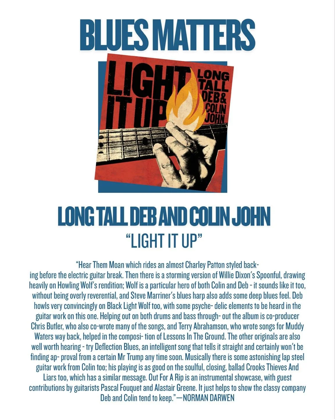 “Long Tall Deb raises attitude to a new latitude. Her songs cook with more smoke and sauce than all of Memphis, and her soul will break your back. Colin John’s guitar flogs you with a cotton branch ’til you bleed honey.